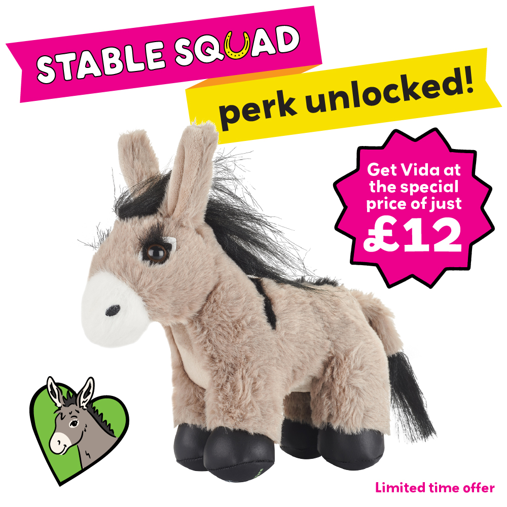 Vida is a soft, fawn-coloured donkey who has been made exclusively for Stable Squad by our good friends at LeMieux. The only way children can make friends with Vida is by being part of our Squad - Vida even sports the World Horse Welfare on one of their hooves!